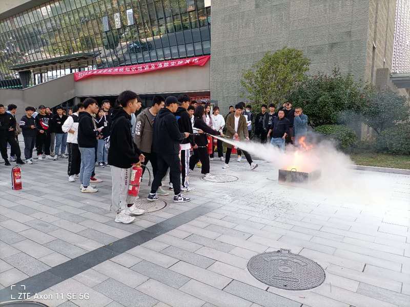 现场模拟起火点,让学生们自己动手使用干粉灭火器进行灭火。