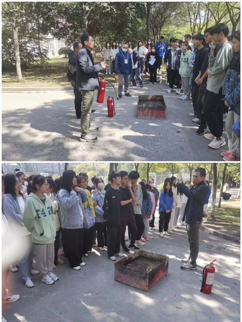 保卫处王科长围绕一懂三会给参加演练的老师、同学们作了一个简短的知识培训,讲解了发生火灾如何正确的逃生和各种火灾的扑灭原理,及手提式干粉灭火器,室内、室外消火栓的正确使用方法,并在现场模拟起火点让学生进行灭火演练。