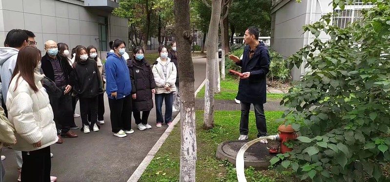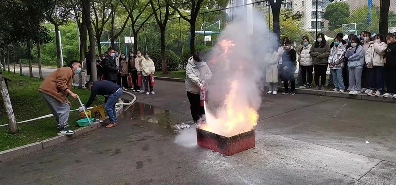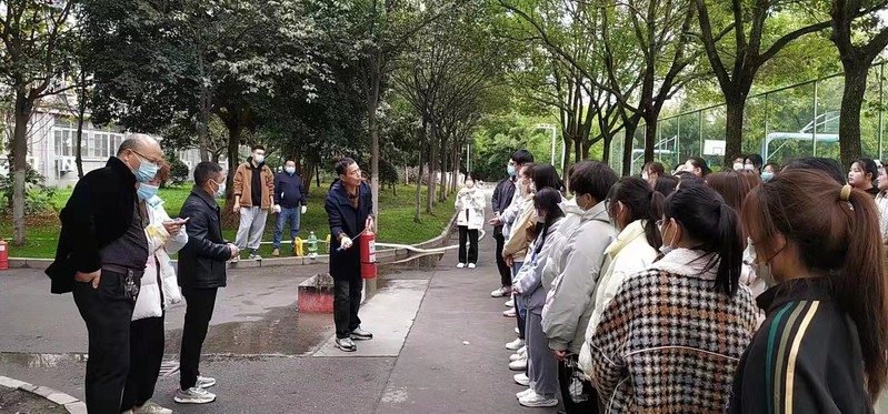 在演练中保卫处消防科王科长讲解了各种火灾的扑灭原理,及手提式干粉灭火器、室内外消火栓的正确使用方法,并在现场模拟起火点让学生进行灭火演练。