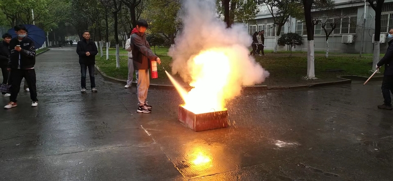 讲解结束后由学生们自己操作演练如何使用手提式干粉灭火器进行灭火。通过此次演练增强了学生的消防安全意识,掌握了手提式干粉灭火器的操作使用步骤及方法,进一步提高了学生应对突发事件的能力。