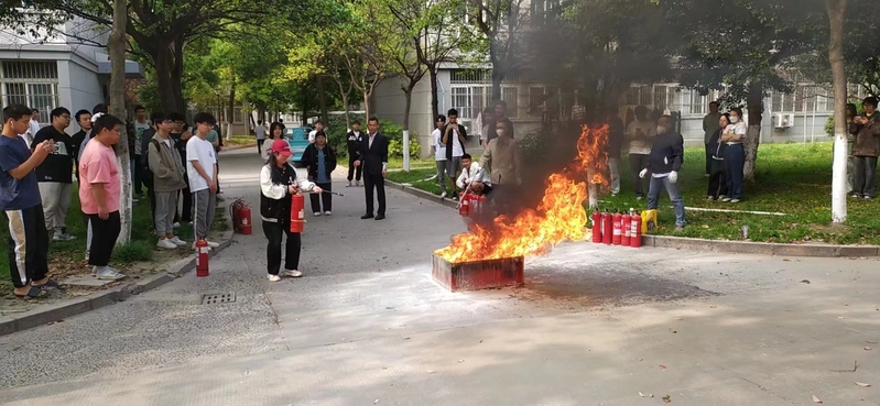 保卫处消防科王科长首先为同学们阐述了消防安全演练的重要意义,随后讲解了干粉灭火器的功能、构造及灭火原理、使用范围,并亲自演示了灭火器的正确使用方法。他强调在使用干粉灭火器时,一定要先拿在手上摇一摇,使罐内的干粉松动,同时站在距离起火点1.5至2米处的上风口或侧风口,用一只手握住灭火器的手把,拔去保险销,另一只手握住软管喷嘴,对准火焰根部,压下提把,待灭火器干粉喷出后,左右扫射灭火。最后还在现场设置起火点,通过现场安全模拟课堂的形式,让同学们亲身体验,真正掌握灭火器的各个使用步骤和细节。