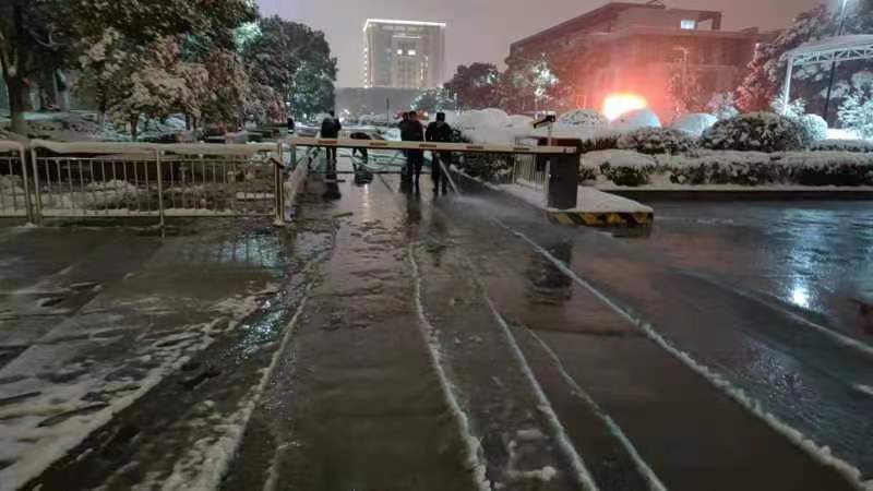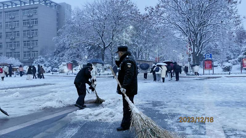 2023年12月18日扬州市普降大雪,湿滑的道路给我校师生的通行带来了诸多不便,为及时消除安全隐患,确保广大师生在校出行安全,学校保卫处组织开展校园扫雪除冰行动。