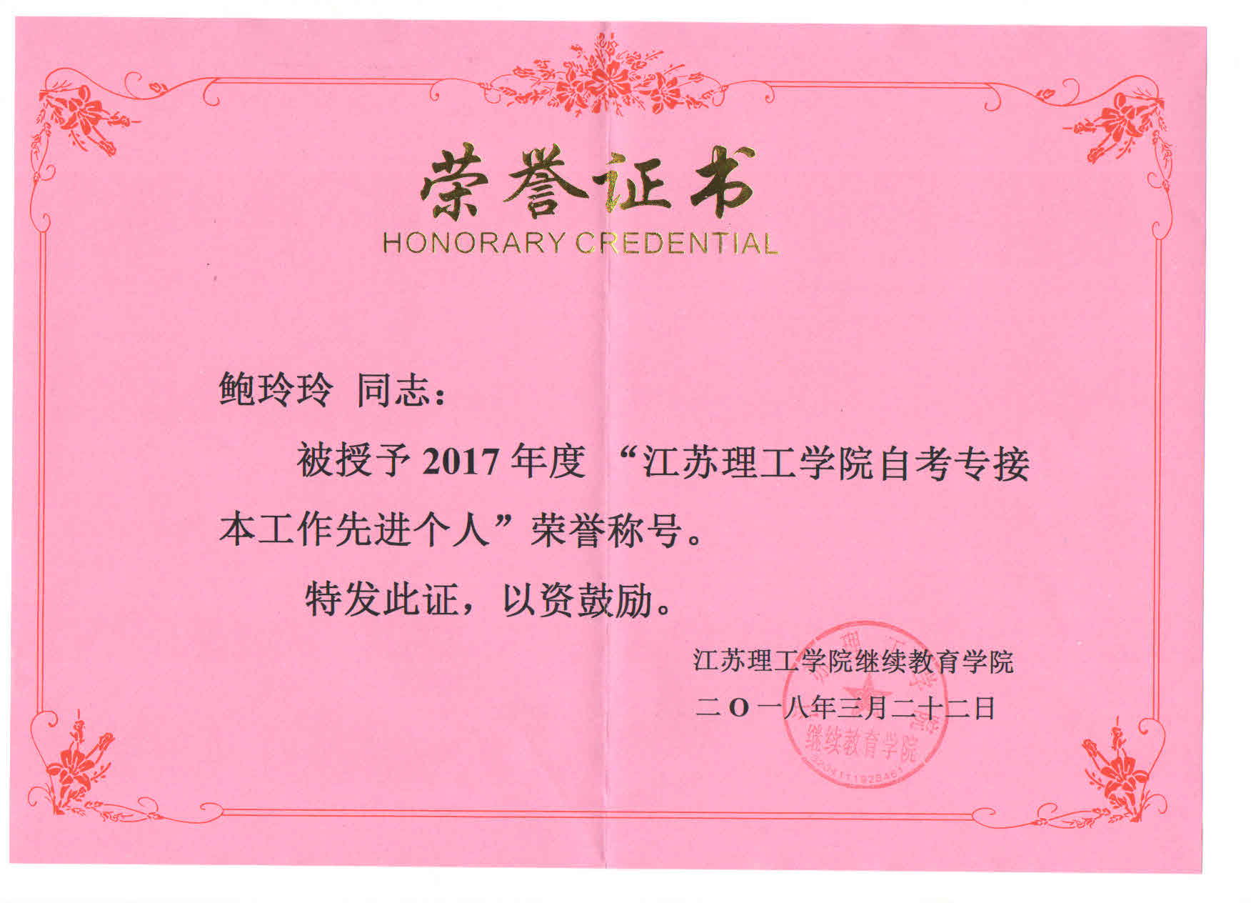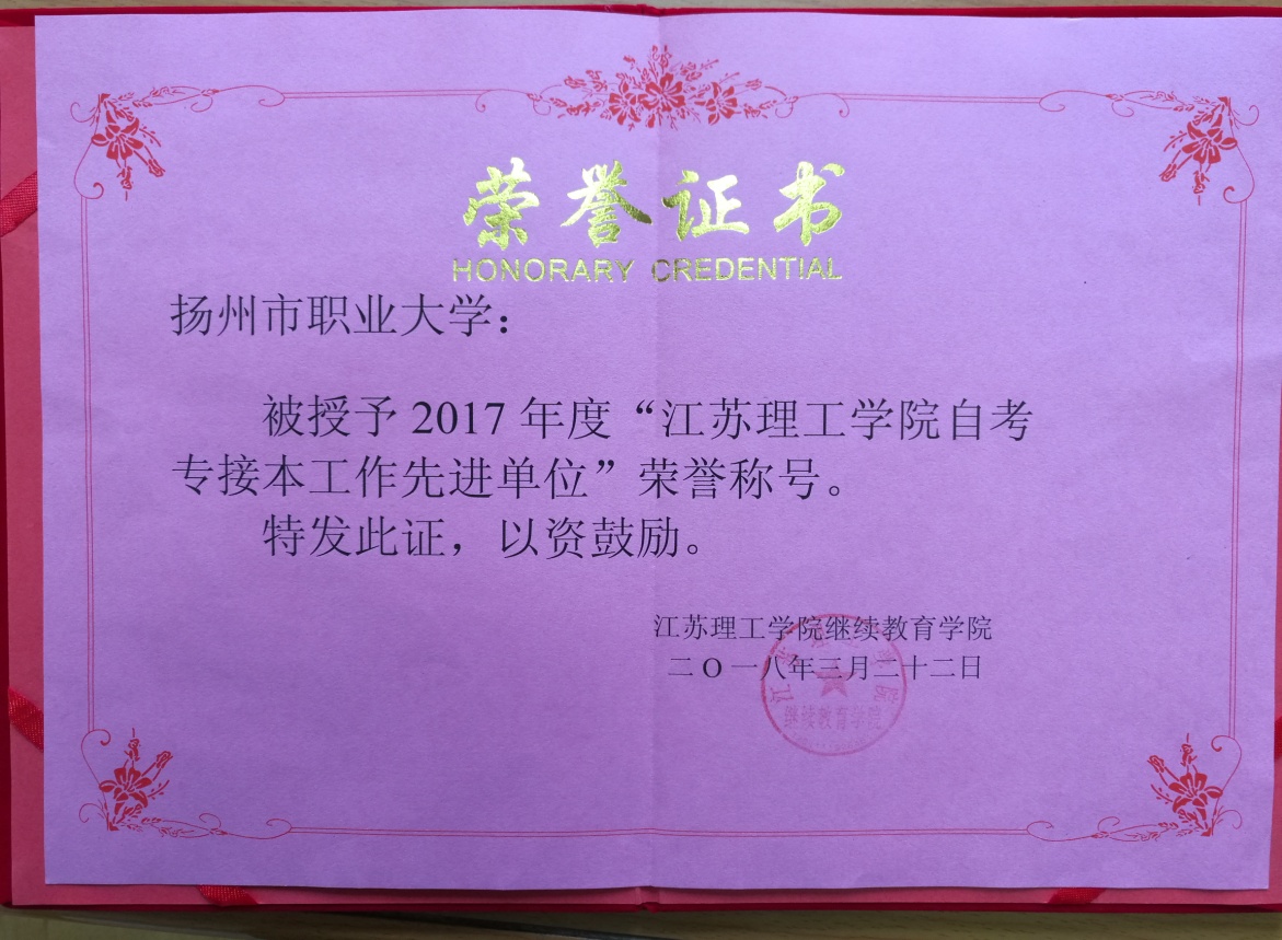 近日,我院荣获江苏理工学院汽车检测与维修专业“专接本”工作先进集体;我院鲍玲玲老师荣获江苏理工转接本工作先进个人荣誉称号。