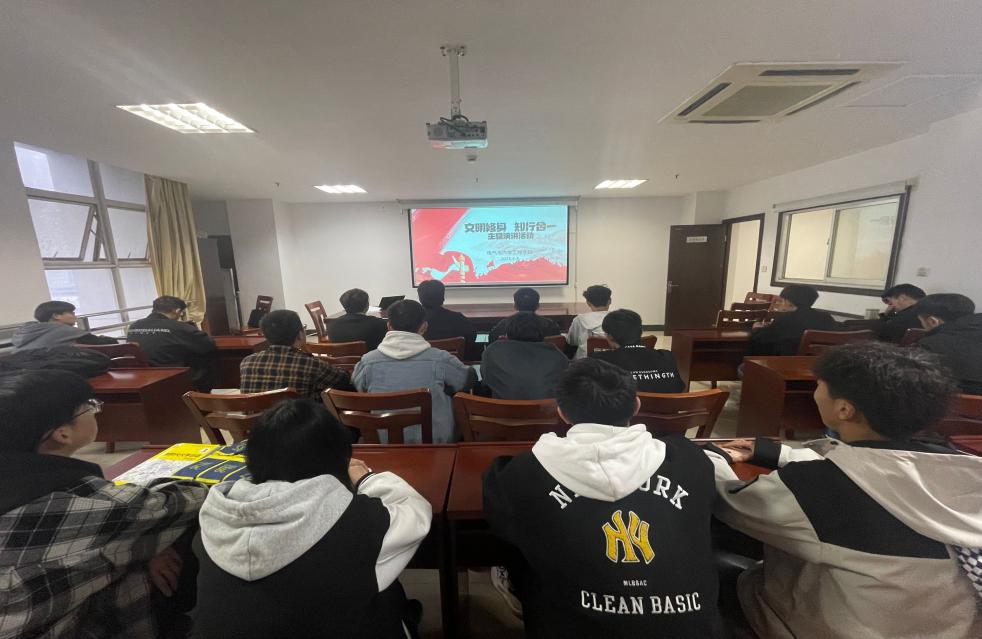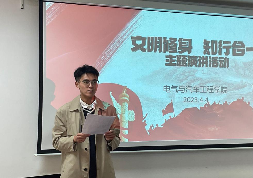 为倡导文明礼仪新风尚,弘扬“讲文明、树正气、塑形象”主旋律,进一步提高学生综合素质和文明修养,4月4日,电气与汽车工程学院在图书馆902开展“文明修身,知行合一”演讲活动,同学们用精彩的演讲倡导全体同学将“文明修身”内化于心,外化于行,争做文明“扬职大人”。