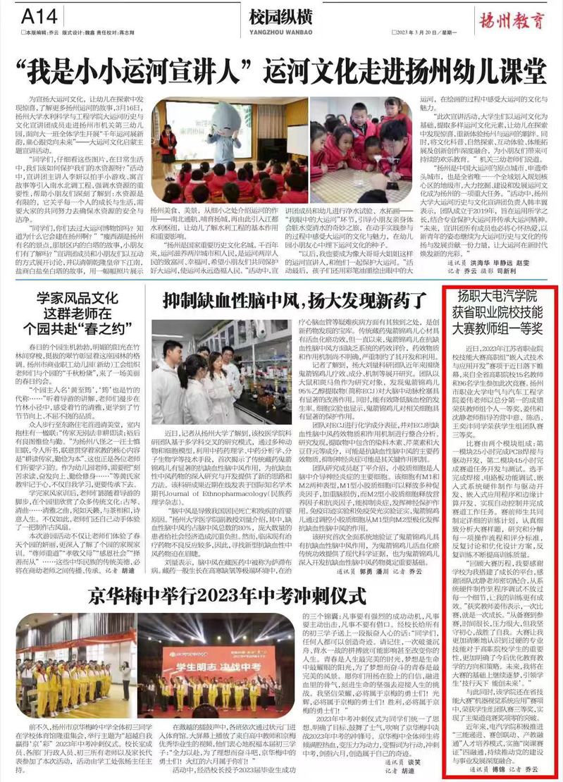 【扬州晚报】扬州职大电汽学院获省职业院校技能大赛教师组一等奖