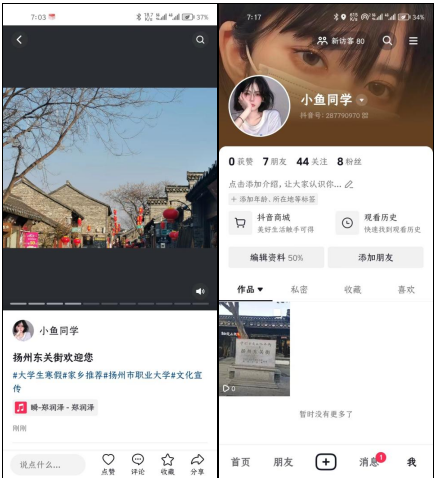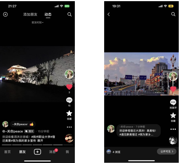 乡村振兴,“微”视频传播“大”能量。 返乡大学生中多名学子用微视频方式为家乡代言,讲好家乡故事。家住湖南凤凰古镇的谭慧、苏州常熟的季燚晨、扬州的俞世缘、宿迁的马盼露等同学用镜头记录下家乡的景点、美食等,通过抖音号宣传家乡文化,让更多人了解家乡历史,打造家乡名片,助力乡村振兴。