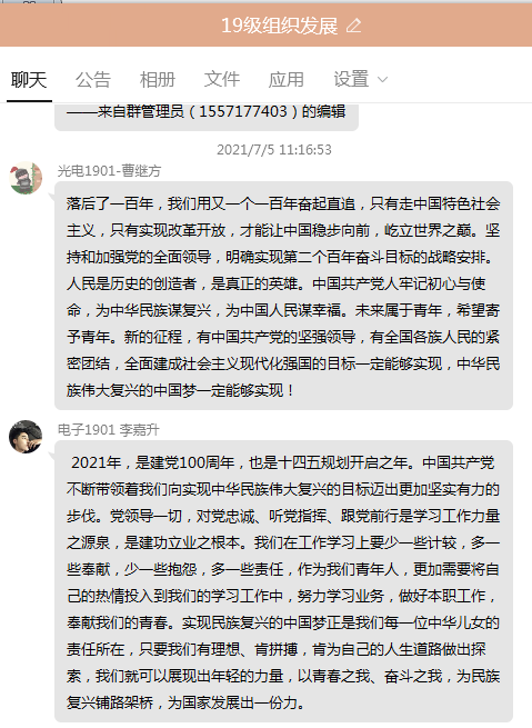 习近平总书记的讲话令人深受鼓舞、倍感振奋,大会结束后,教师和学生党员在群里踊跃畅谈,表达自己的感想体悟,深情表达对党的崇敬与祝福。大家心潮澎湃,为中国共产党领导下取得的巨大成就感到由衷的自豪。大家纷纷表示,习近平总书记的重要讲话思想深刻、内涵丰富,令人鼓舞、催人奋进,为我们牢记初心使命、坚定理想信念,向着全面建成社会主义现代化强国的第二个百年奋斗目标迈进,为实现中华民族的伟大复兴而努力奋斗指明了方向。在今后的工作中,大家要坚定理想信念,传承红色基因,践行初心使命,为学校教育事业的高质量发展做出自己的贡献。
