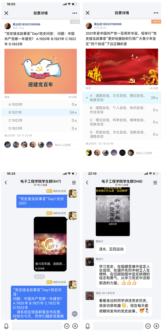 为迎接建党百年,我校电子工程学院利用寒假期间在线上组织开展了“迎新春,党史接龙故事荟”活动。2月17日-3月1日,2019、2020级13个班级,每个班轮值接龙,在947人的电子工程学院学生群中,发布一个自己整理编辑的党史故事,并且开展党史知识每日一答。