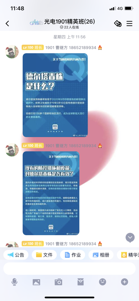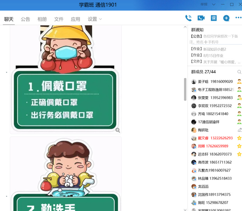 通信1901组成了班级的疫情防控小组,每天更新中高风险同学的信息,尤其是在扬同学的生活,每天在班级群里做好疫情防控温馨小提醒,每日相互问候、相互关心,关心每一个同学。