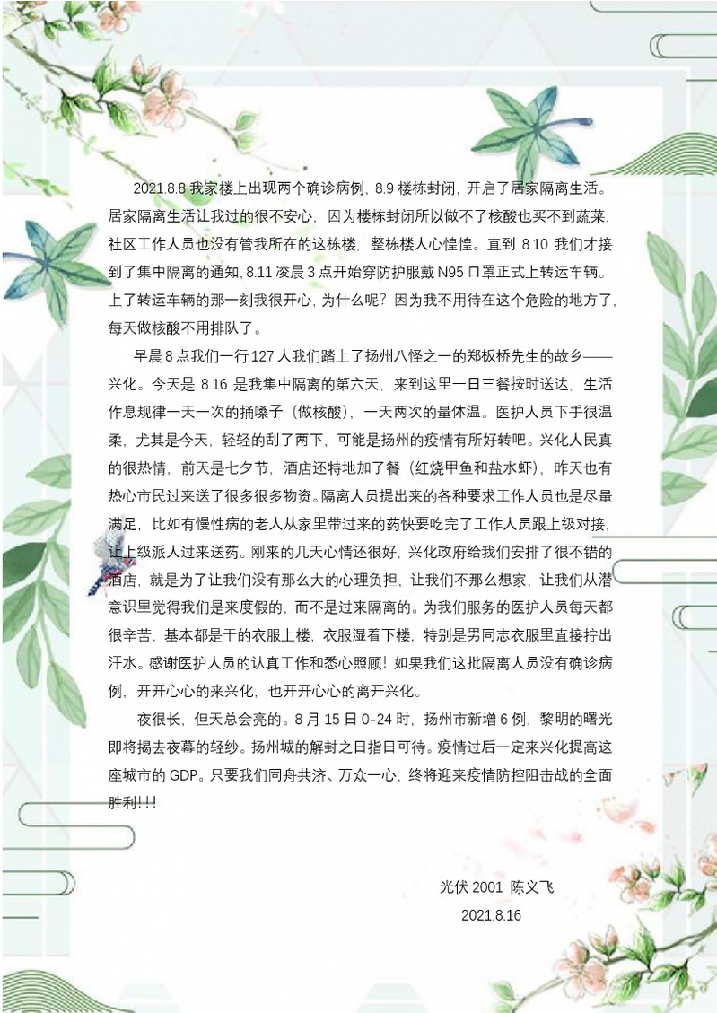 光伏2001的陈义飞作为次密切接触者,在兴化集中隔离,班上同学每人写了一句话,制作了一份电子贺卡,送去了班级老师和同学的关切之情,陈义飞同学也制作了视频,还给全班同学写了一封信,展示了他隔离的居住环境和生活。