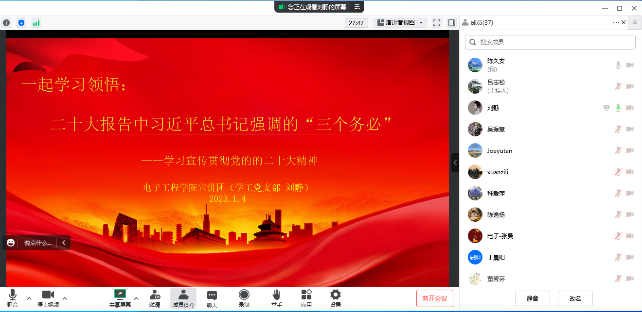 1月4日下午,刘静以《二十大报告中习近平总书记强调的“三个务必”》为题通过腾讯会议进行了宣讲。习近平总书记在报告中强调,全党同志务必不忘初心、牢记使命,务必谦虚谨慎、艰苦奋斗,务必敢于斗争、善于斗争,坚定历史自信,增强历史主动,谱写新时代中国特色社会主义更加绚丽的华章。刘静结合毛泽东同志提出的“两个务必”进行了历史回顾和进一步阐释。大家从中强烈感受到使命担当、忧患意识和斗争精神。