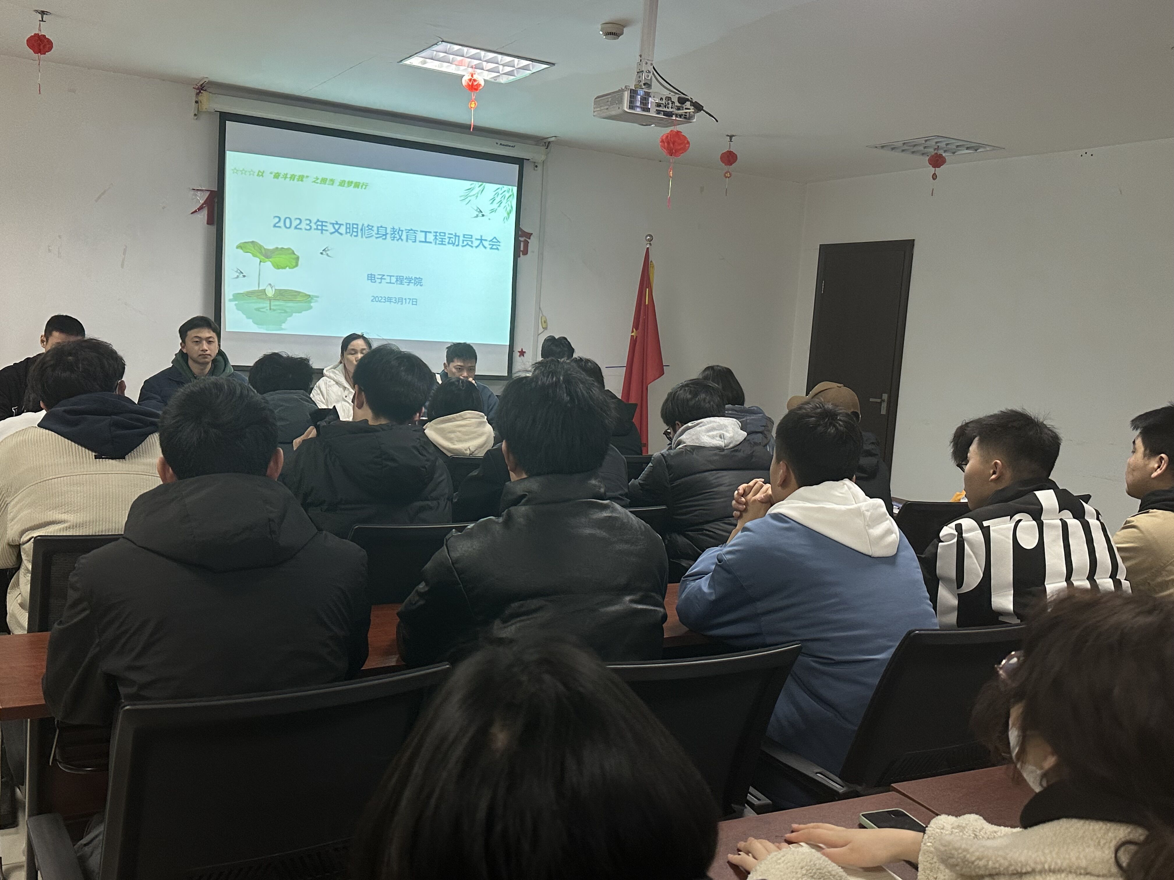 3月17日,电子工程学院在校图书馆903室召开2023年文明修身教育工程动员大会。会议由院学生会主席杨锦同学主持。院党总支副书记陈久安出席了大会。