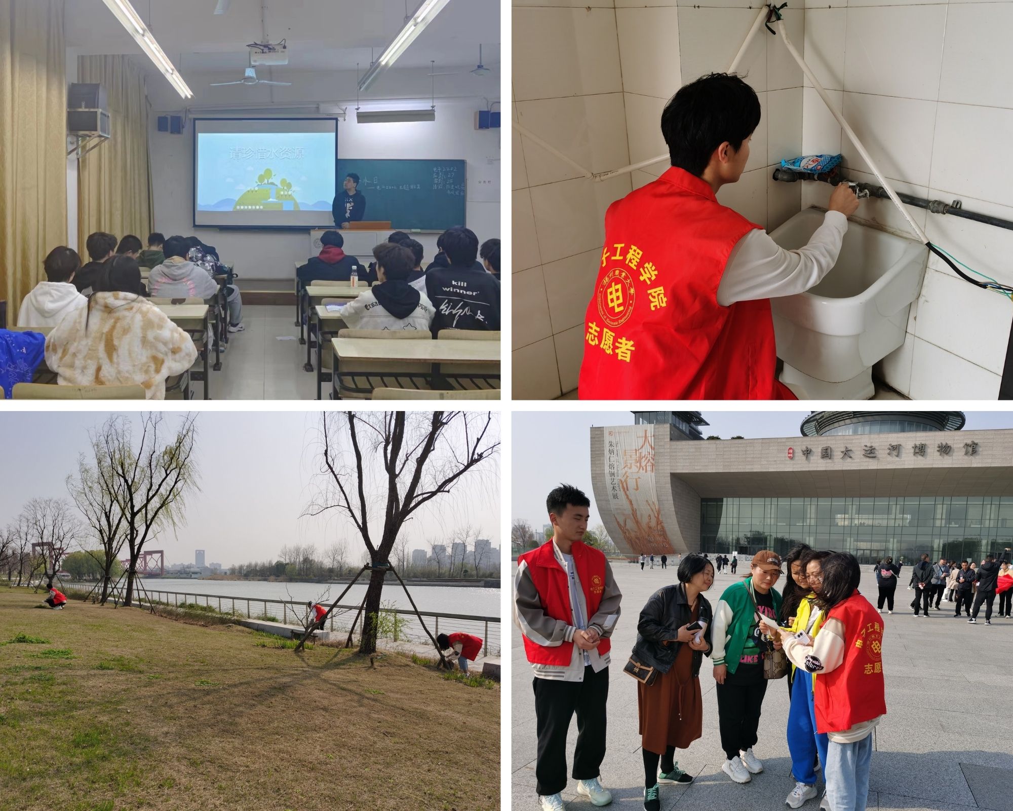 系列活动中,院学生会向全体师生发出倡议,号召大家以节水为荣,养成文明用水好习惯,将节水口号变成实际行动。各班陆续召开主题班会,开展节水知识比赛,制作手抄报,让每一位同学真正了解节水的目的和意义,从心底自发产生爱水护水的意识。学院青年志愿者积极行动起来,在教学区、生活区检查水龙头是否有滴水现象。有同学在厕所拧紧水龙头;有同学动员父母,用淘米水浇花;有同学在宿舍用防水胶布缠好滴水的管子并及时报修……他们以自己言行带动身边的同学一起加入节水用水的队伍中。学院青年志愿者身着红马甲来到大运河畔,或提着垃圾袋,用铁钳捡拾河边残留物和白色垃圾,或展开自制手抄报,向游人宣讲节水知识宣传……同学们在志愿行动中一次次展示青春风采。