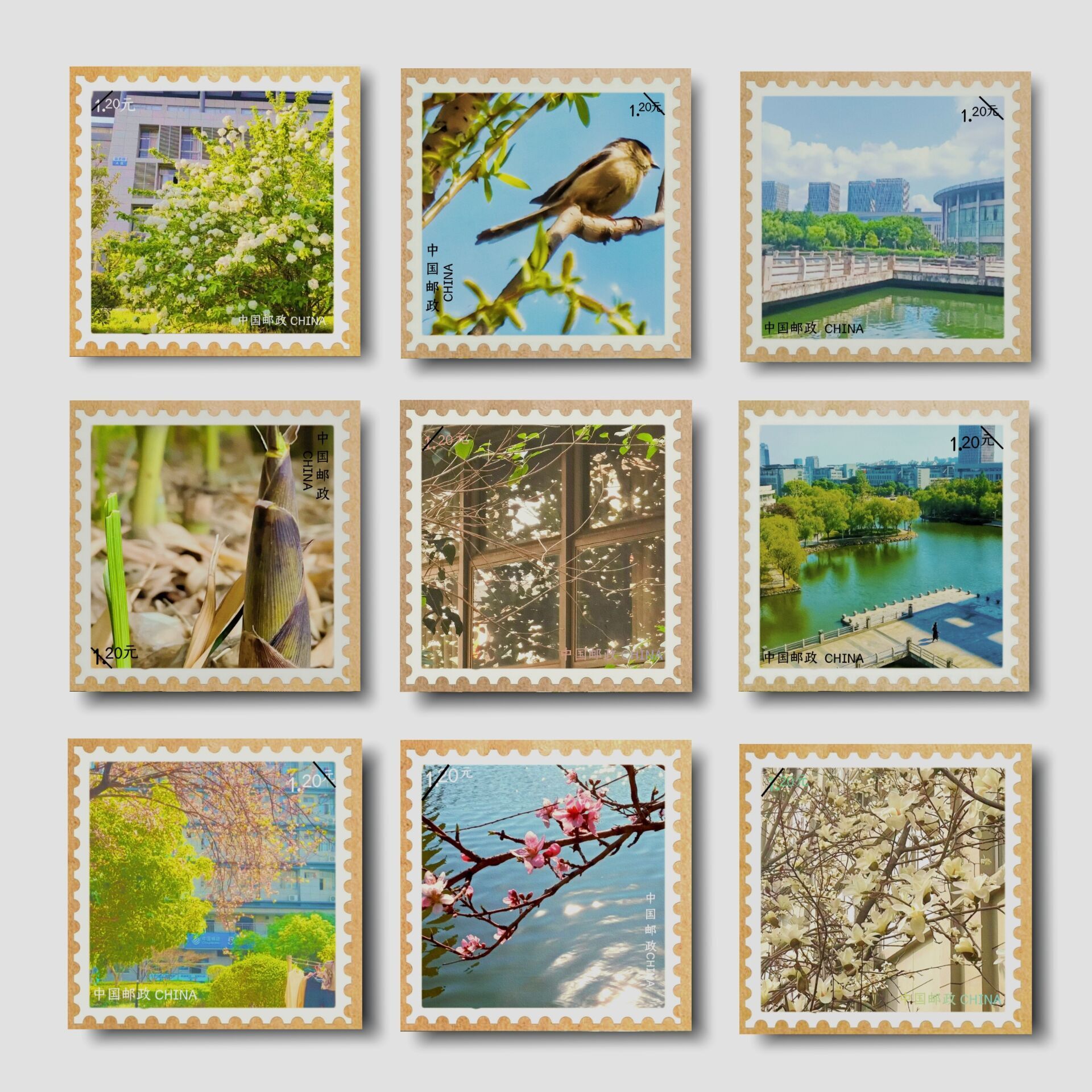 把我们的校园美景设计成邮票吧。”“邮之声”志愿队吴东航同学的提议立刻得到大家的响应。同学们在校园里寻找春天的踪影,有随风舞动的柳枝,有枝头鸣春的小鸟,有破土而出的春笋……这一幅幅校园美景被制成了邮票,在学院各类群中供师生欣赏,广受好评。