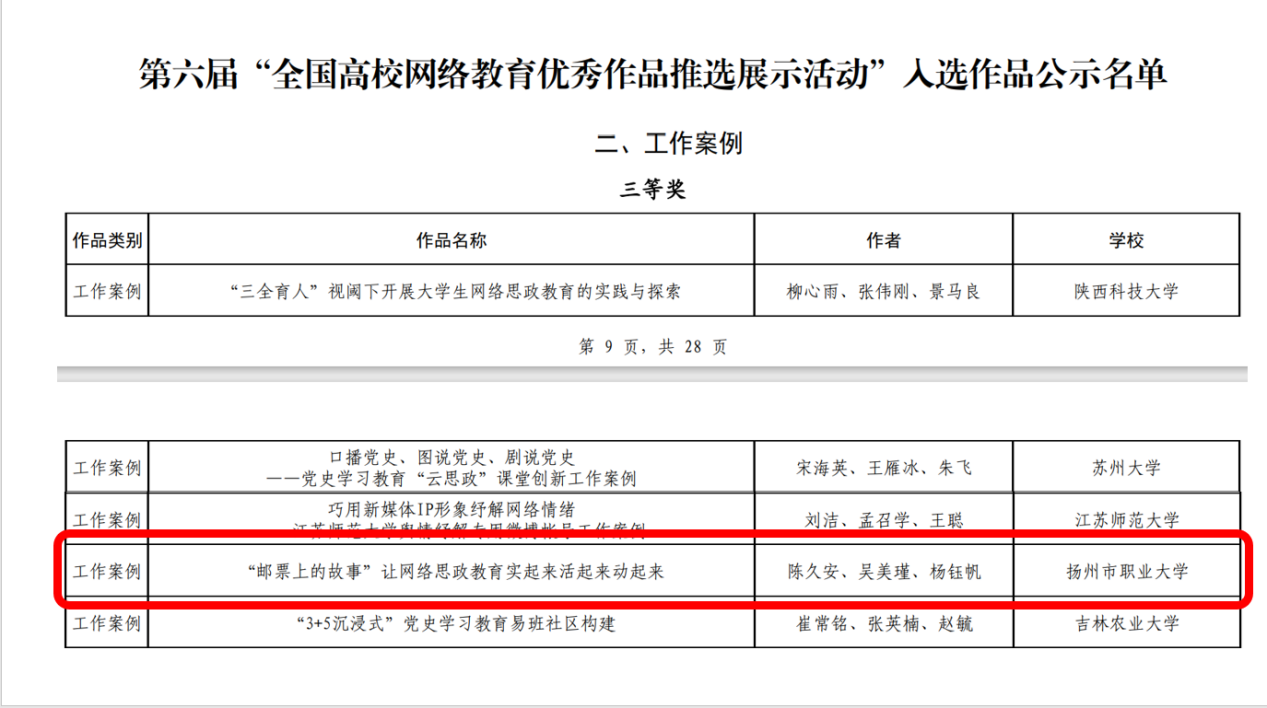 近日,由教育部思想政治工作司、中央网信办网络社会工作局联合举办的第六届“全国高校网络教育优秀作品推选展示活动”遴选结果公示,我校报送的思政工作案例《“邮票上的故事”让网络思政教育实起来活起来动起来》荣获三等奖。