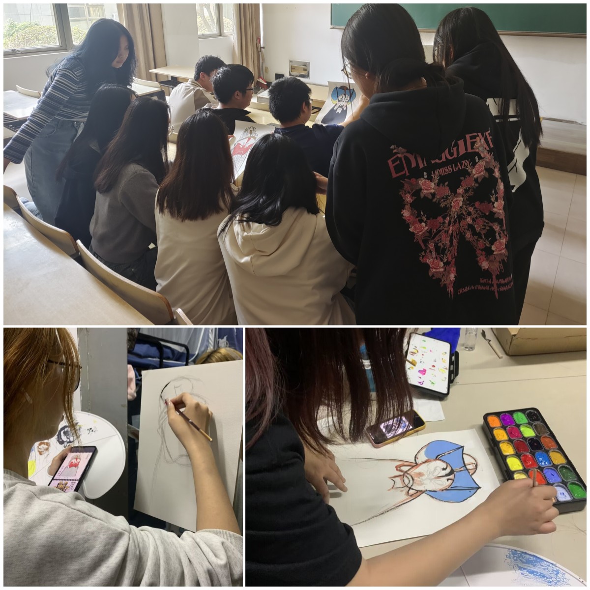 邮票上的京剧脸谱太漂亮了,我可以尝试画一画,电信2203班王云云的想法立刻得到同班石怡菲同学的积极响应。一笔一笔细心勾勒线条,一点一点用心描绘色彩,蝴蝶谱大笑脸,浓黑色环眼,黑色开口舞,黑耳毛,头戴草帽圈的张飞脸谱形象终于跃然纸上;两眼之间抹一条横纹,与鼻尖至额头的一条竖黑线形成“+”字形,脸色自中透粉,白满辉,头戴倒缨盔的廉颇脸谱形象也被手绘出来了。同学们争相传阅这两份劳动成果,赞叹不已。