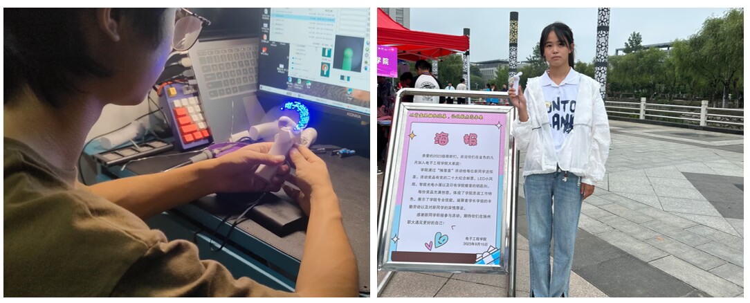 说起盲盒里具有专业特色的奖品小风扇,不能不提及通信2102班康治民同学。新生报到前一周,他和他的同学利用课余时间,带上自己的电烙铁来到实验室,从一个个散装元器件开始焊接起,经过一次次尝试,终于LED小风扇成功稳定运行起来。小风扇做好了,输入想要表达的一句话非常关键,学长学姐们你一言我一语商量着赠给学弟学妹的祝福语。随后,康治民同学打开keil软件,利用上课学习到的单片机编程知识,通过数据传输线,将编写好的程序下载到LED小风扇中,并设置了文字显示模式。最终,几个小风扇成功亮起了LED屏显字幕:插上理想翅膀,扬起青春风帆;在这里,遇见更好的自己;以“心”迎新,电子学院同心启航;满“新”欢喜,只为遇见你……