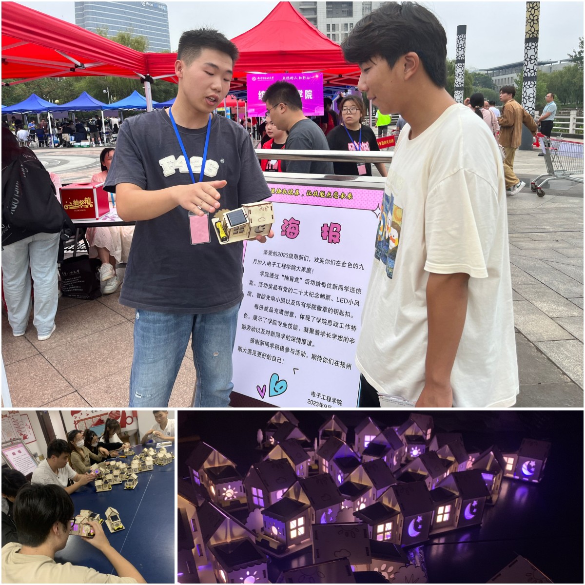 来自光电2301班邵秦同学抽到了智能光电小屋。这是一套太阳能光电光电转换灯装置,是由学院专业社团——光电创新实践社的同学们亲手制作的盲盒礼物。在光电2201班濮阳盛祥同学的演示下,小屋里的LED小灯在太阳光下立刻亮了起来。邵秦同学惊喜道:“真的太神奇了!这份奖品让我对智能光电专业产生了浓厚兴趣,希望不久的将来我也能亲手做一套这样很酷的小装备。”