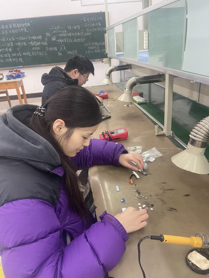 为了这份新年礼物钱君剑毛乔懿两位同学带上自己的万用表、电烙铁等工具来到学校实验室,摆放好电子元器件,测试电阻、LED灯珠的性能,用万用表测出电阻阻值并且做好记录,检查LED灯珠的亮灯情况,做好焊接电路的准备工作。
