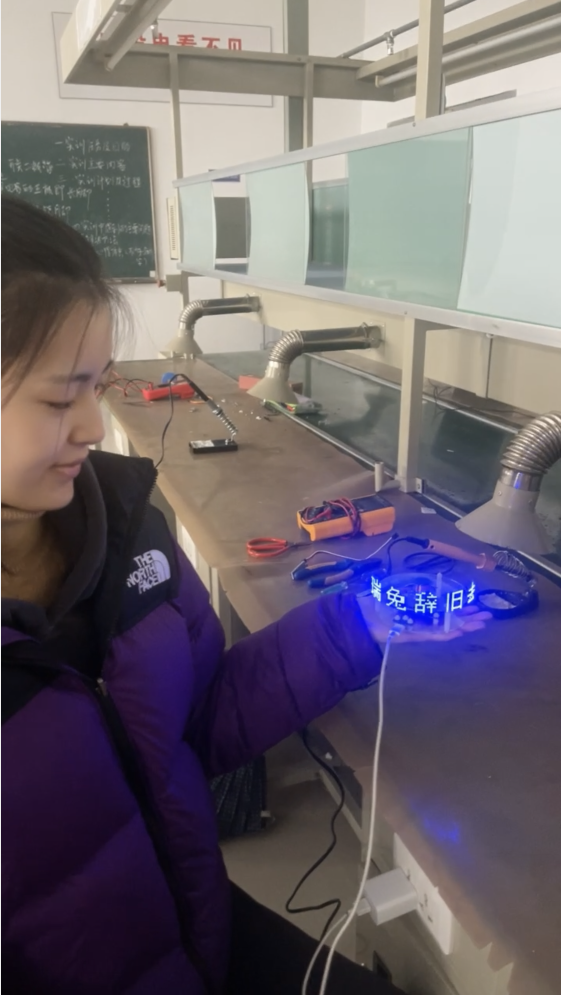 毛乔懿同学在认真地焊接、调试LED旋转显示屏主体是采用一排LED灯,通过单片机的控制来调整LED的亮灭,并且使LED灯高速旋转,采用了机械转动来替代替代扫描显示,根据视觉暂留现象,让人直观的看到汉字或图案。经过认真细心焊接和不断地调式,最终LED显示屏成功旋转360度亮了起来。太好了,只要插上电源,通过电机带动屏幕的旋转,我们就可以在屏幕上展示动态的效果啦!毛乔懿欢呼雀跃起来