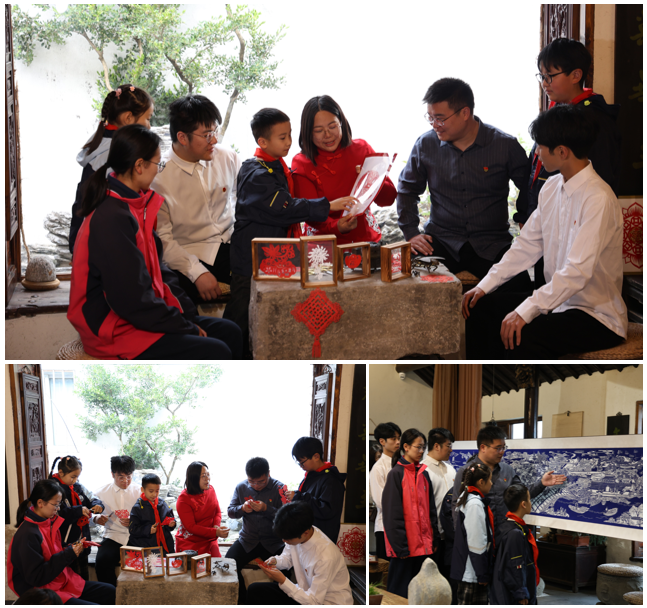 党课活动期间,同学们走访了熊崇荣的弟子王蔚老师的左琴右书文化空间工作室。王蔚对扬州职大将非遗剪纸融进大中小学生的运河思政课堂进行了点赞。她对同学们说:“作为新生代扬州剪纸艺人,我有时想法多,定力不够足,熊老师行动不便仍带病坚持的行为感动了我,让我永记于心。这样的工匠精神我们一定要大力传承弘扬!”大家深受启发和鼓舞。随后,同学们听取了王蔚老师的剪纸介绍,并跟着学剪纸。那儿是白塔,这里是五亭桥……在扬州剪纸长卷《大运河扬州段》前,同学们惊喜连连,流连忘返,巧夺天工的非遗剪纸文化浸润着他们的心灵。