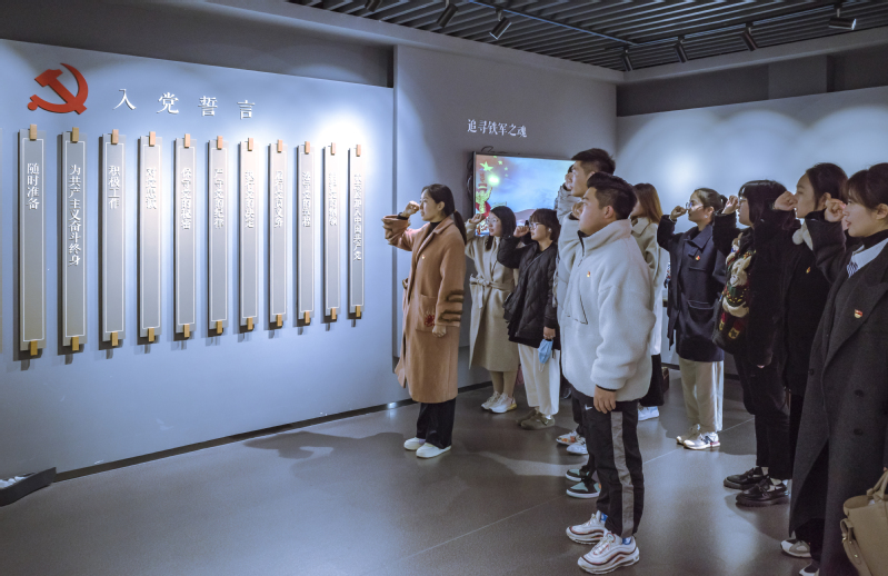 随后,大家来到“红色地标”郭村保卫战纪念馆,大家沿着纪念馆展示的历史脉络和时间顺序,先后参观了三个主题展厅,完整回顾了1940年新四军在江都郭村反击国民党顽固派军队进攻的自卫战斗。在馆内,新入党的学生党员在学工党支部书记蔡燕带领下进行了庄严的入党宣誓,接受了思想洗礼。