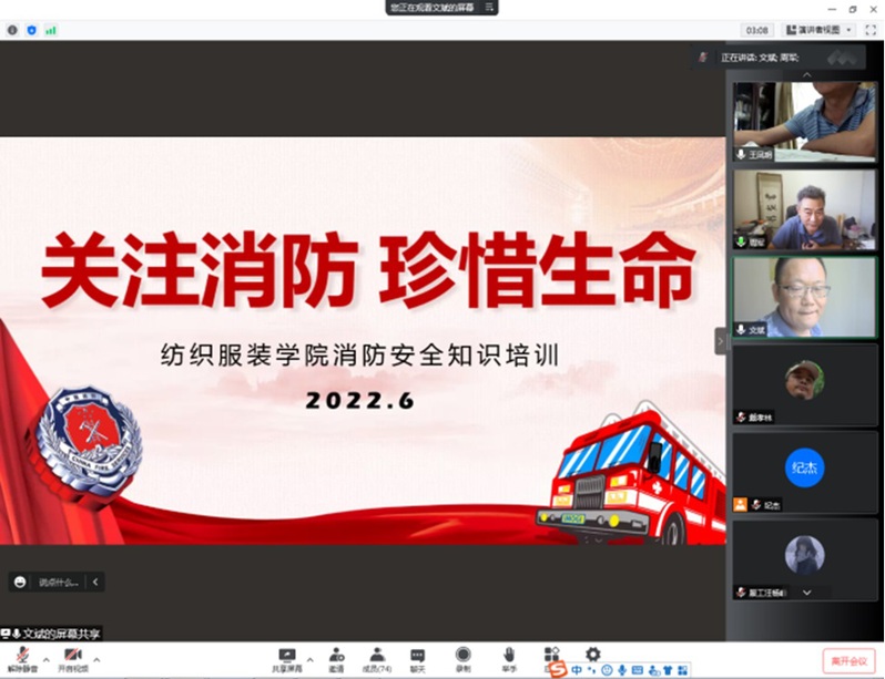根据《省教育厅办公室关于加强全省高校实验室火灾防范工作的通知》(苏教办科函【2022】17号)文件精神以及学校《关于开展实验实训室火灾防范工作的通知》校设字(2022)5号的要求。6月15日下午,学院举办全院师生员工线上“消防安全”知识培训。全院近300名师生参加,首先观看宣传片《隐患分析》,然后学院服装设计实训基地文斌老师为全院师生进行《关注消防 珍惜生命》培训。