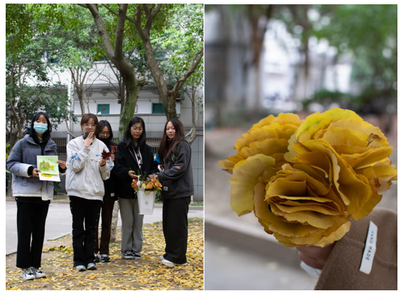 收集来的落叶,每个人都不一样;眼里的秋天,每个人也都不一样。同学们们决定用这些拾来的树叶,通过拼贴组合成一朵花,定格住这短暂而美丽的秋天。