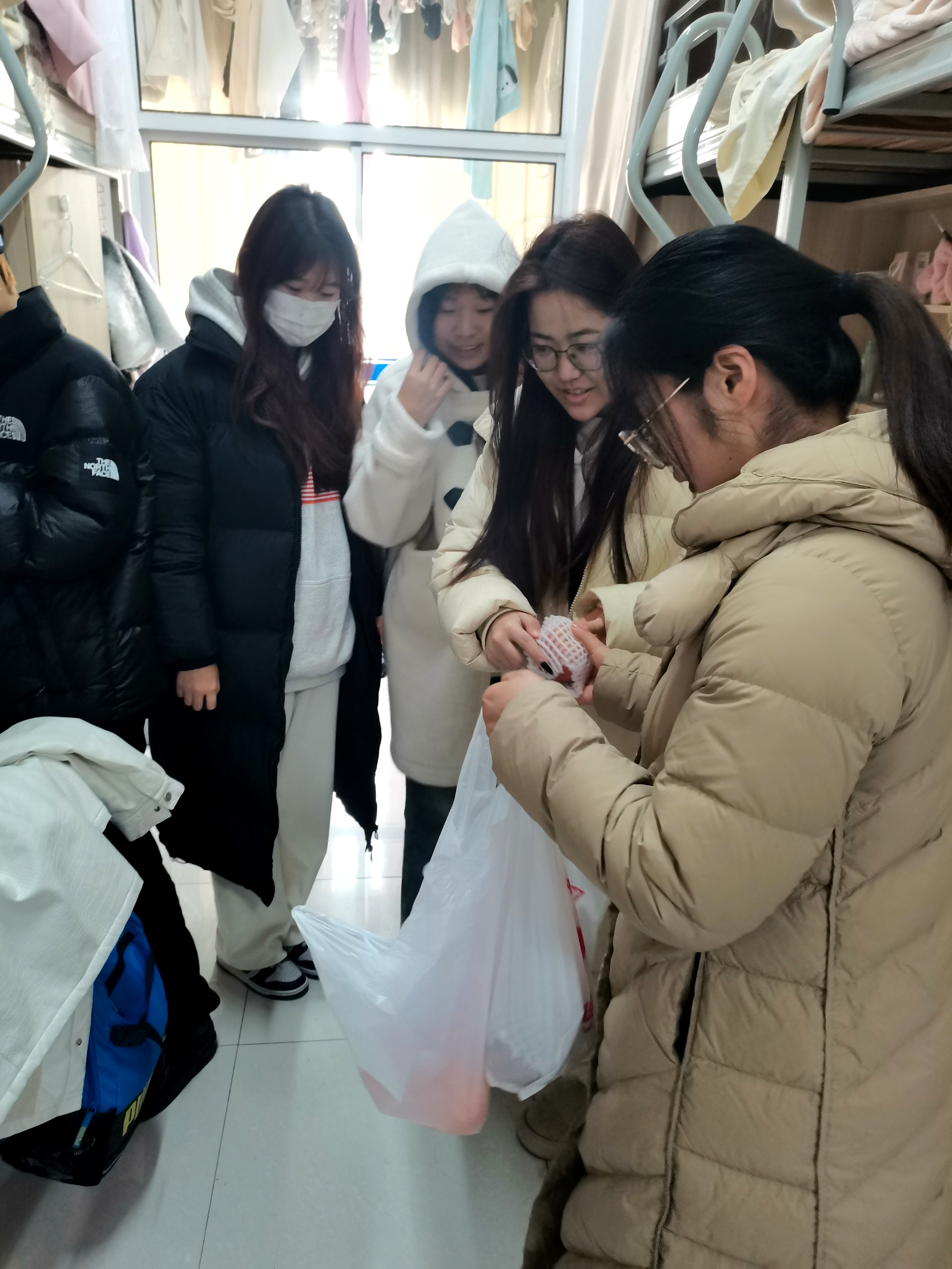 新年即将来临,纺织服装学院组织老师们来到学生宿舍走访,一方面对冬季宿舍安全进行隐患排查,主要检查消防安全、用电安全、寝室文明卫生等方面的情况,另一方面了解同学们在寝室的生活状况和思想动态。老师们一个一个房间敲开门,仔细检查了宿舍里的各项安全,确保无安全隐患,同时见到干净整洁的宿舍还给每个人的桌上放了一个红红的苹果作为赞许。