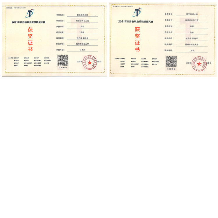 周筛群2022年江苏省纺织服装行业服装设计制作职业技能竞赛 | 二等奖 | 江苏省纺服行指委 | 省级 | 2022 |
