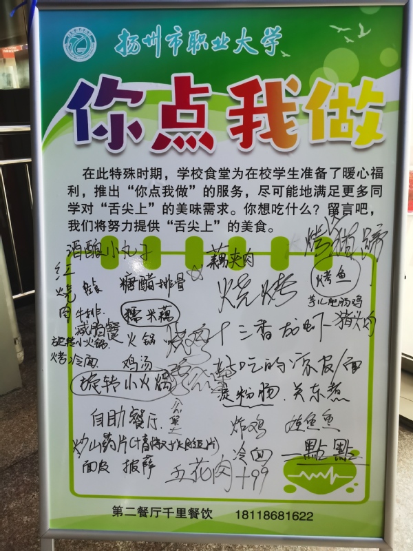 自4月中旬开始,第一餐厅、第二餐厅和教工餐厅同时推出“你点我做”的服务,尽可能的满足师生们对“舌尖上”的美味需求。