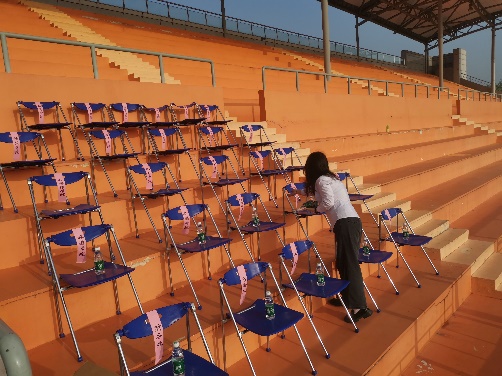运动会召开当天,苏宁银河物业办公室全体人员及田径场保洁人员、体育馆楼宇管理员均提前到岗,对现场卫生及主席台布置进行准备,包括现场增加垃圾桶数量、协调人员循环保障场地卫生、主席台桌椅布置等工作,所有工作均高质量完成,为赛场上的运动健儿们提供一个干净、整洁的运动场地,全力保障运动会的顺利进行。