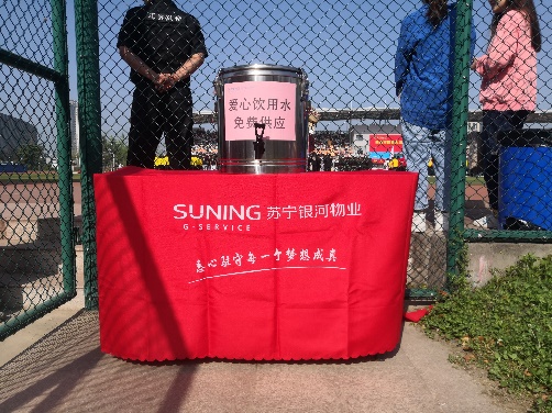 同时,在运动会当天,苏宁银河物业还推出爱心服务,在操场入口、看台东西两侧分别准备了爱心饮用水,为会场上奋力拼搏的运动员设置饮用水补给站。
