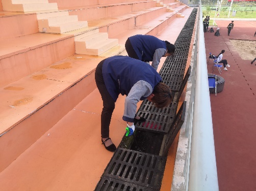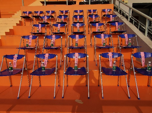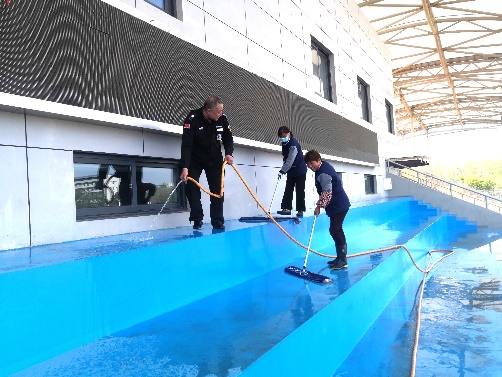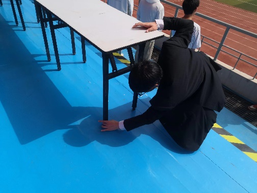 运动会召开前三天,对主席台、观众台的每一个座位、台阶、雨棚进行了全面冲洗、擦拭,同时,将看台区域的窨井盖内部杂物、垃圾也逐一清掏,卫生死角全面覆盖。