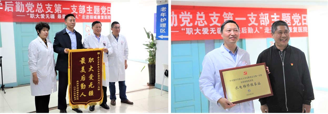 活动在后勤党总支许建平书记的致辞下拉开帷幕,一支部党员、医护工作者先后表演了配乐朗诵《哪里有需要哪里就有我》、手语表演《听我说谢谢你》、长笛演奏《感恩的心》、男女声合唱《我的祖国》等节目。期间,党员代表、维修中心主任高甫宽同志向康复医院赠送扬州市职业大学后勤党总支第一支部驻扬城康复医院水电维修服务站铜牌,并表示将尽最大努力为医院做好水电维修等方面的帮扶工作,扬城康复医院院长致感谢辞并向后勤党总支赠送锦旗。