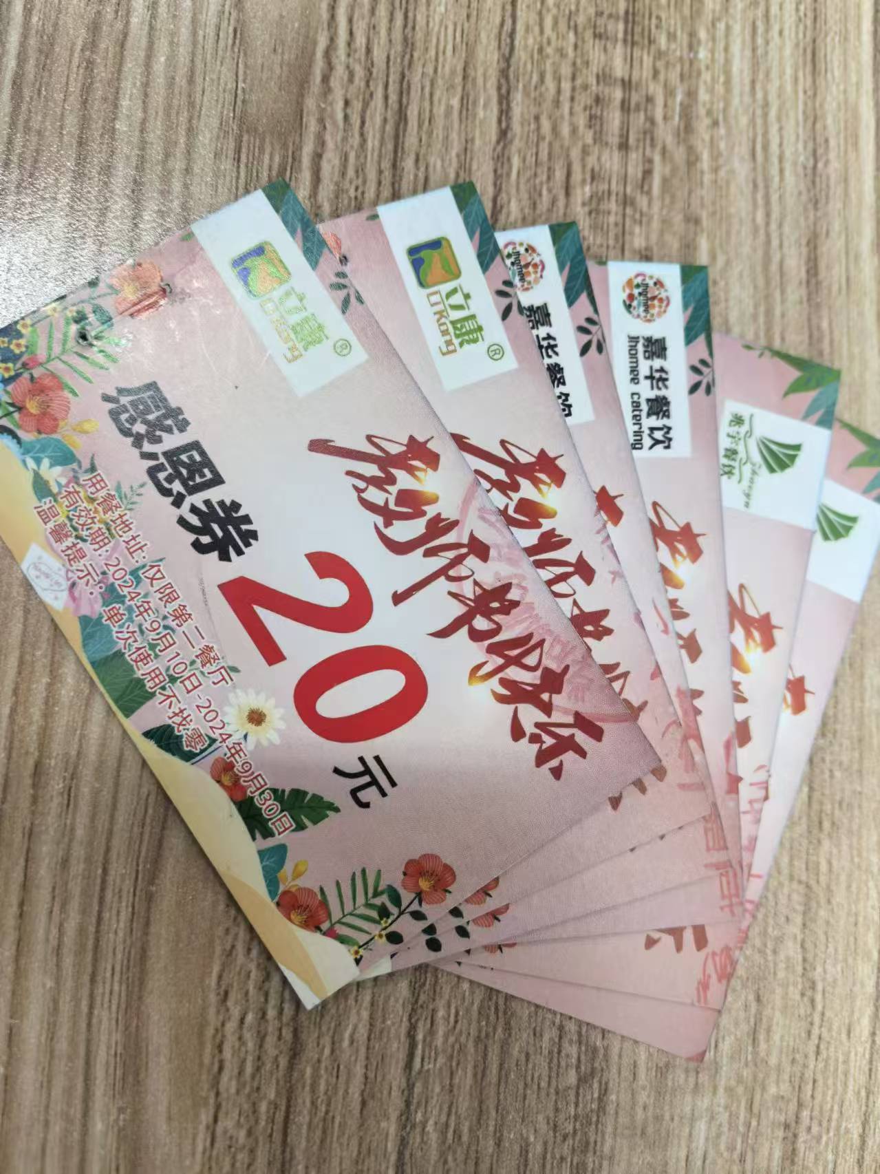 呕心沥血育英才,倾囊相授释情怀。为了向辛勤耕耘的老师们表达敬意和感谢之情,学校食堂的嘉华餐饮、兆宇餐饮、立康餐饮三家公司为全校教职工准备了总面值120元的6张感恩餐券,餐券可在第一食堂一楼餐厅、二楼餐厅、第二食堂一楼餐厅任意档口消费。通过一份特别的小心意,让老师们感受到来自学校的温暖与关怀。