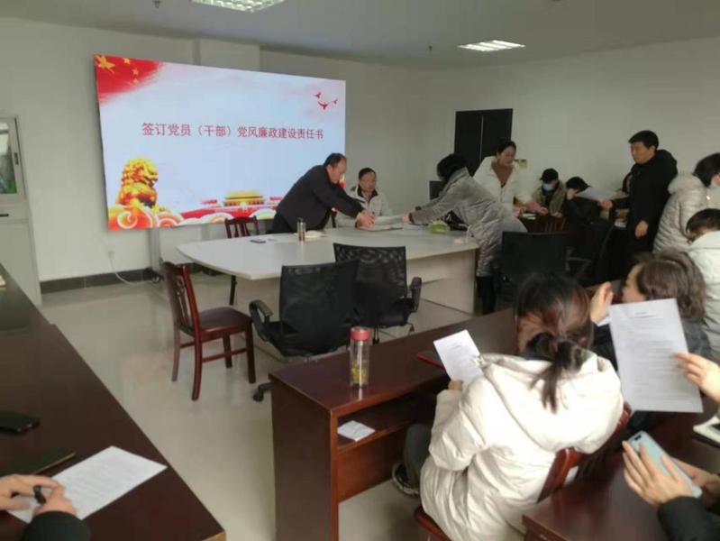 所有人员表示一定严格按照学校党委和支部要求,增强廉洁自律意识,筑牢拒腐防变的思想道德防线,廉洁、创新、高效地做好中心工作;最后所有人员签订并递交了《党风廉政建设责任书》。