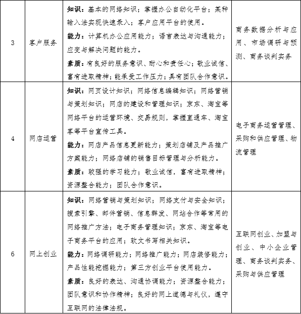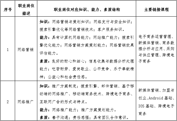 本专业培养与我国社会主义现代化建设要求相适应,拥有良好的职业道德和职业素养,具有网络信息收集、网络市场推广、网店运营管理、网站运营策划、网络市场分析和网络创业等方面的工作能力,能够胜任网络营销、网络推广、客户服务、网店运营、网站运营、网上创业等工作岗位需求,能够熟练运用电子商务平台进行网上商务活动,适合在企业、事业、政府等一线从事电子商务活动、满足江苏经济建设和社会发展需要的高素质技能型人才。落实立德树人根本任务,弘扬社会主义核心价值观,坚持育人与育才相统一,培养德智体美劳全面发展的中国特色社会主义合格建设者和可靠接班人。