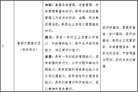 本专业培养学生具有良好职业道德,诚信敬业、专业知识扎实、专业技能熟练,能胜任店铺开发、商品品类管理、营销策划、商品陈列设计、采购管理、营运管理等工作的应用型专门人才。落实立德树人根本任务,弘扬社会主义核心价值观,坚持育人与育才相统一,培养德智体美劳全面发展的中国特色社会主义合格建设者和可靠接班人。