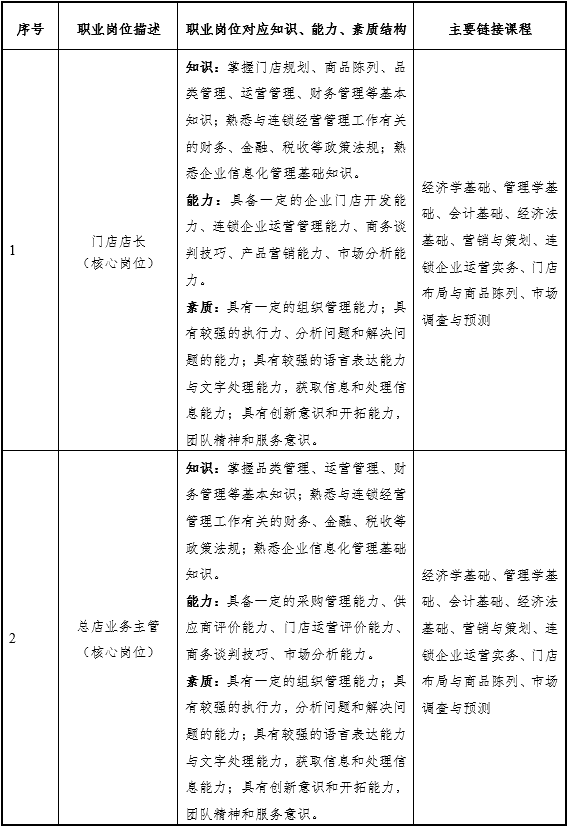 经济学基础、管理学原理、会计基础、经济法基础、营销与策划、连锁企业运营实务、门店布局与商品陈列、品类管理实务、加盟与创业、中小企业管理、采购与供应管理、市场调查与预测、商务谈判实务、电子商务等。