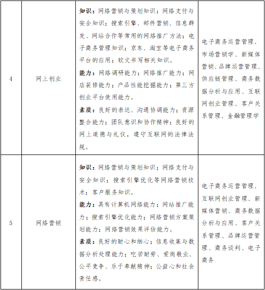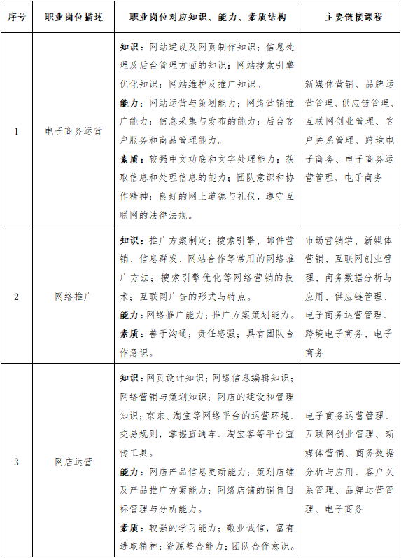本专业培养具备网络营销策划、网络市场分析、网络信息收集、网络市场推广、语言表达与沟通、网店运营管理、网上贸易、创业等方面能力,熟悉相关法规,能在网络营销、网络推广、客户服务、网店运营、网站运营、网上创业等岗位工作,基础扎实、知识面宽、能力强、素质高,富有创新精神和专业拓展能力的复合应用型人才。落实立德树人根本任务,弘扬社会主义核心价值观,坚持育人与育才相统一,培养德智体美劳全面发展的中国特色社会主义合格建设者和可靠接班人。