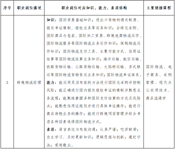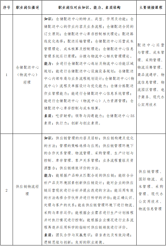 本专业培养掌握现代商贸流通及物流管理基本知识与基本技能,具有企业物流整体规划能力、物流信息系统设计与实施能力,较强的社会主义市场经济的竞争意识与创新能力、较高的计算机应用能力和外语水平,能在商贸流通行业物流中心、供应链管理部门、国际物流部门胜任企业中高层运营管理工作,适应江苏经济和社会发展需要的高素质应用型人才。落实立德树人根本任务,弘扬社会主义核心价值观,坚持育人与育才相统一,培养德智体美劳全面发展的中国特色社会主义合格建设者和可靠接班人。