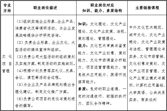 本专业以打造“宽口径、跨学科、强能力”的人才理念为指引,旨在培养具有良好思想政治素质、职业道德和敬业精神,拥有宽阔文化视野、良好文化素质和现代产业理念,具备文化学、经济学、管理学理论知识,以及较强文化创意与表现能力,能够从事文化市场运作、文化产业经营管理、文化项目策划执行的复合应用型人才。落实立德树人根本任务,弘扬社会主义核心价值观,坚持育人与育才相统一,培养德智体美劳全面发展的中国特色社会主义合格建设者和可靠接班人。