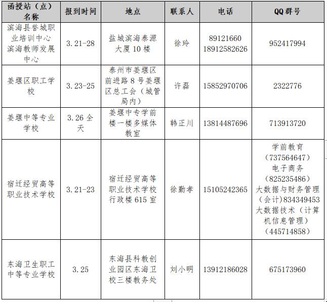 各函授站(点)报到时间、地址及QQ群号见下表: