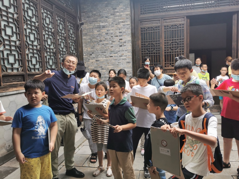 活动现场,朱老师带领孩子们从家庙中的各方石刻、讲到文选井、隋文选楼、照壁砖雕等,每到一处,都能从细微处入手,扩展讲述阮元的生平,也让孩子们对于这位三朝阁老、九省疆臣有了更为深刻的了解。