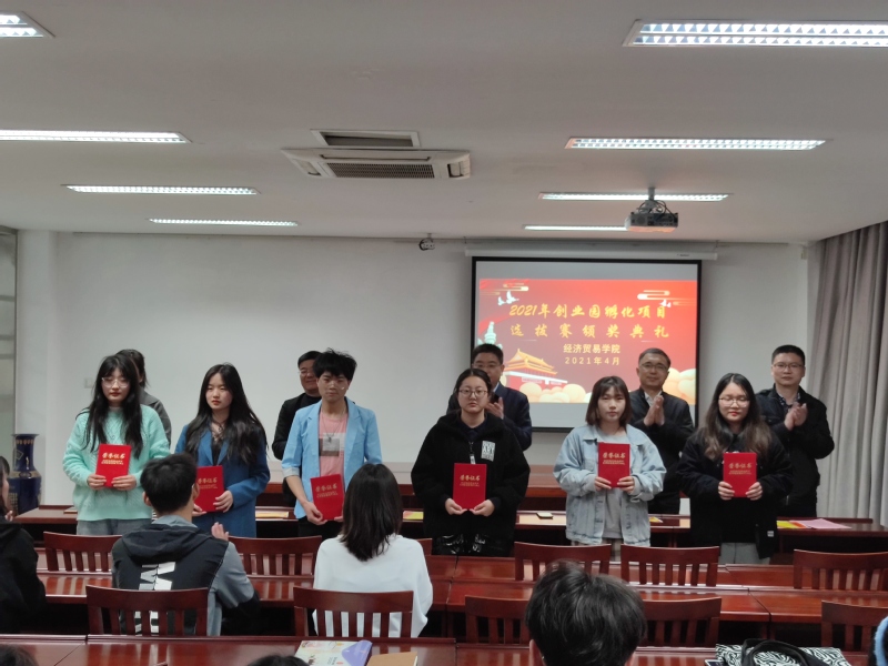 为贯彻落实党中央、国务院关于“大众创业、万众创新”和“六稳”、“六保”工作部署,营造良好的大学生创新创业氛围,激发大学生创新创业热情,更好服务于地方经济社会发展。4月7日下午,经贸学院在勤行楼B511会议室举行了“2021年创业园孵化项目选拔赛”大学生项目评审和颁奖典礼。马克思主义学院和经贸学院老师为18名获奖学生进行颁奖。