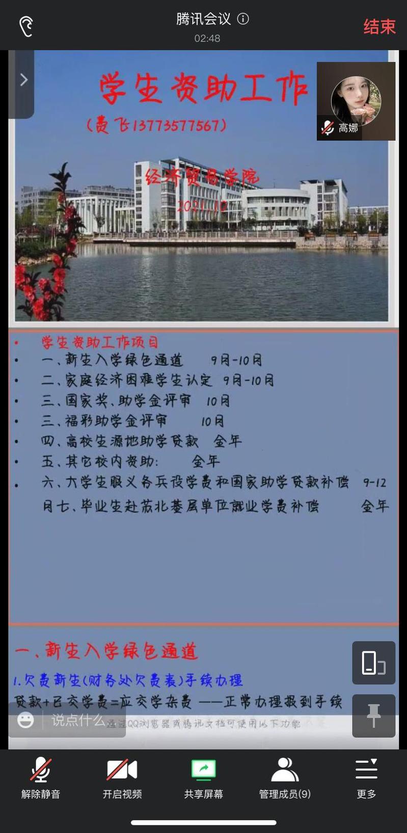 为确保2021级新生班学生资助工作的顺利开展,10月15日下午,经贸学院召开线上资助工作培训会。新生各班班主任助理、班级临时召集人参加了会议。会议由学院负责资助工作的费飞老师主持。