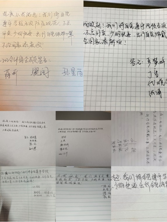 各班班主任介绍了当前多地区严峻的疫情形势,分析了疫情传播的特点,重温了各项防疫规范,重点包括封闭式校园管理、请假制度、不点外卖、少购快递、佩戴口罩等要求。全班同学还统一学习了《常态化疫情防控期间学生纪律处分暂行办法》、《致全体同学的疫情防控倡议书》,同学们纷纷在《抗疫从我做起》承诺书上庄严签字。承诺自身作则,为打造安全校园贡献自己的一份力量。