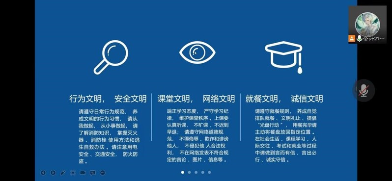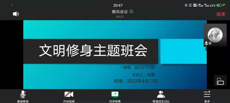 按照学校《关于进一步加强校大学生基础文明建设工作的通知》及有关会议精神的总体要求,为进一步提高经贸学院全体学生道德修养和人文素养,推动全面发展,建设文明和谐美丽的校园,20224月中旬,经贸学院组织各班级开展了线上“文明修身”主题班会。