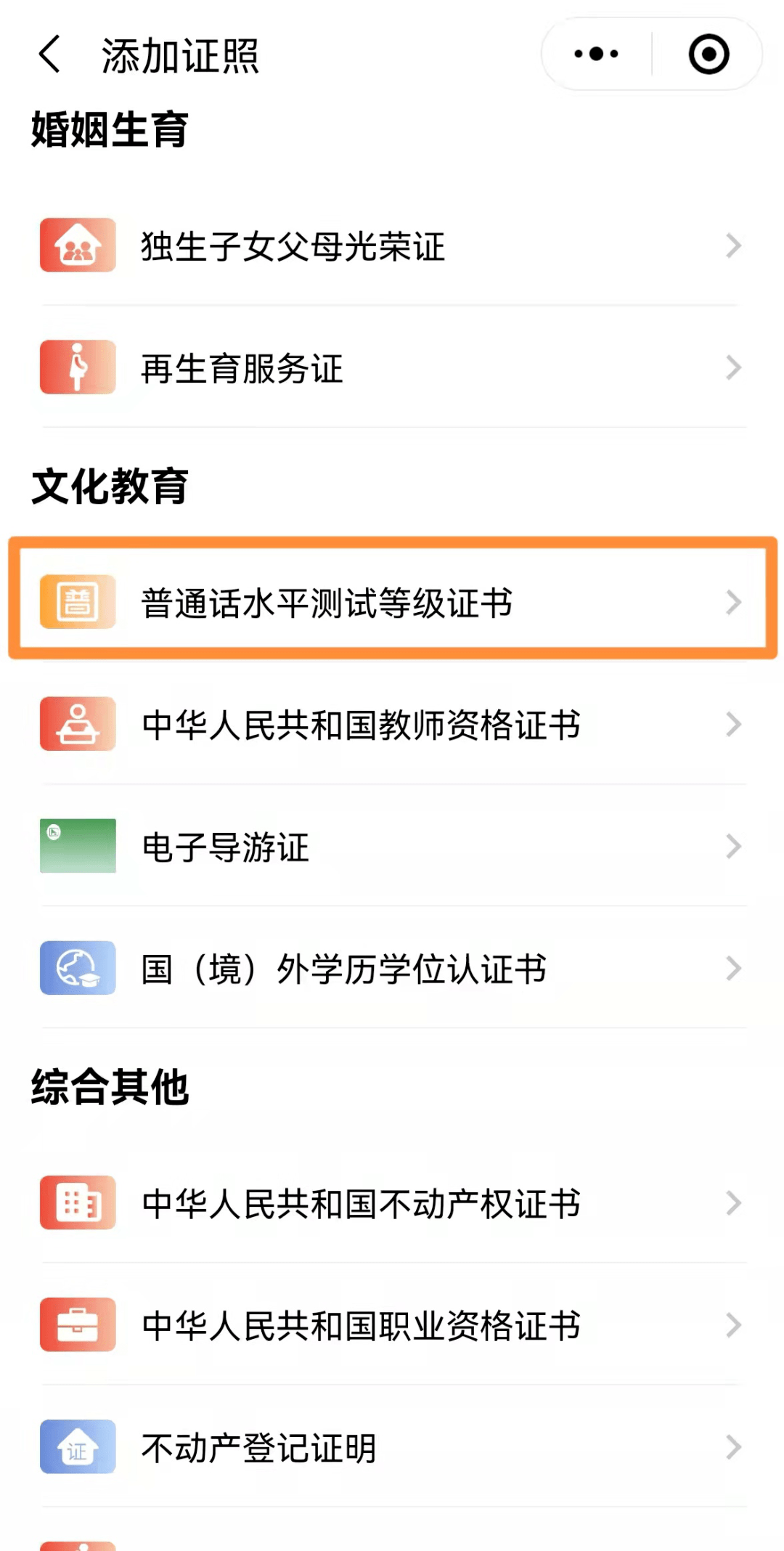 02在“文化教育”选择“普通话水平测试等级证书”。